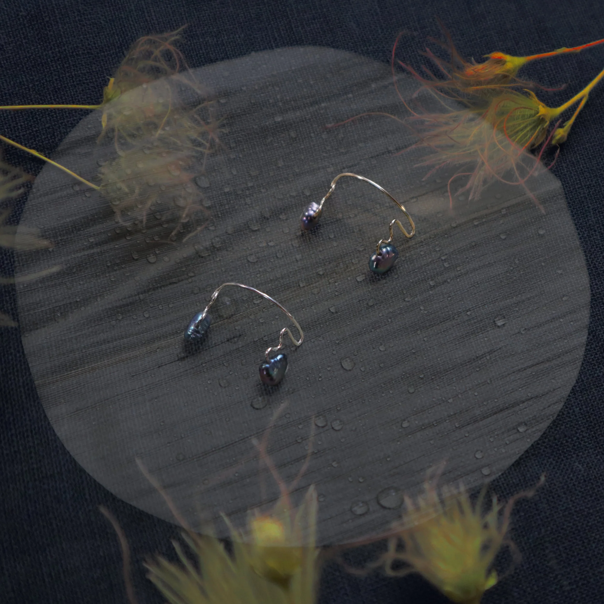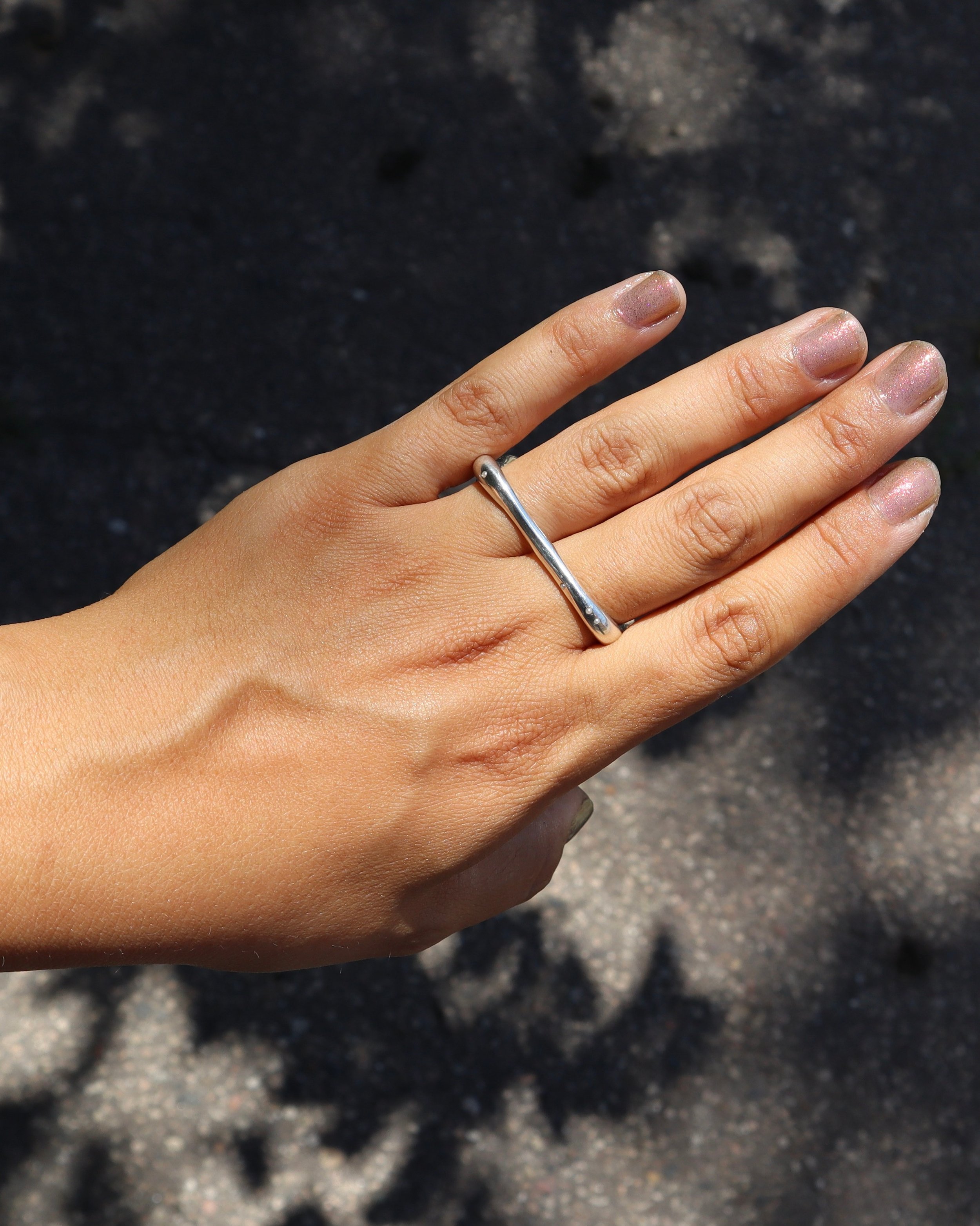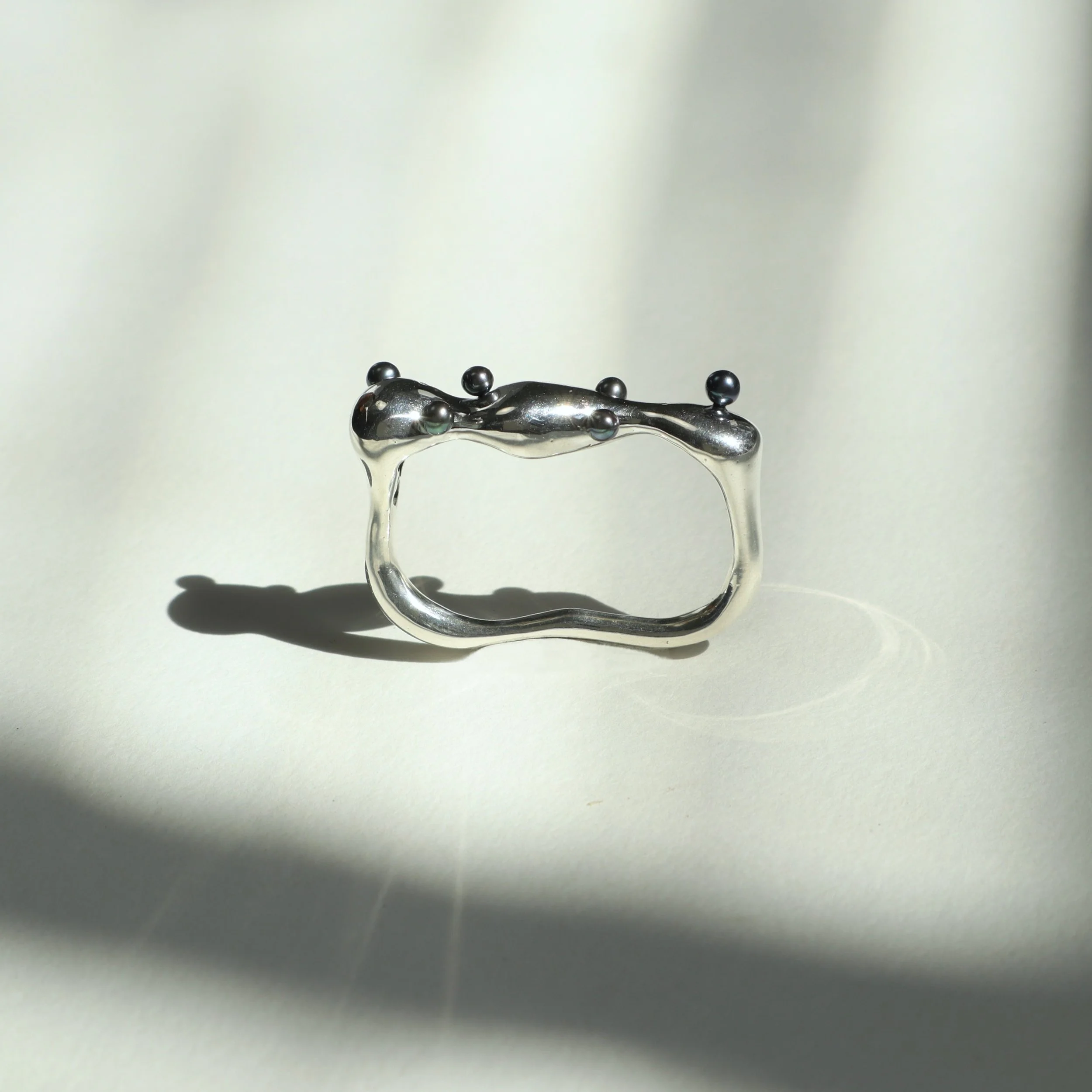 Inspired by lightplay on the surface of water, the Undulation Ring captures the tension and movement of graceful ripples. The sand casting process leaves a raw, porous texture on the metal which contrasts with smooth, shining waves and iridescent pearls. Worn on two fingers, this bold, sculptural piece is reversible—revealing either the sublime black or subtle white freshwater pearls.